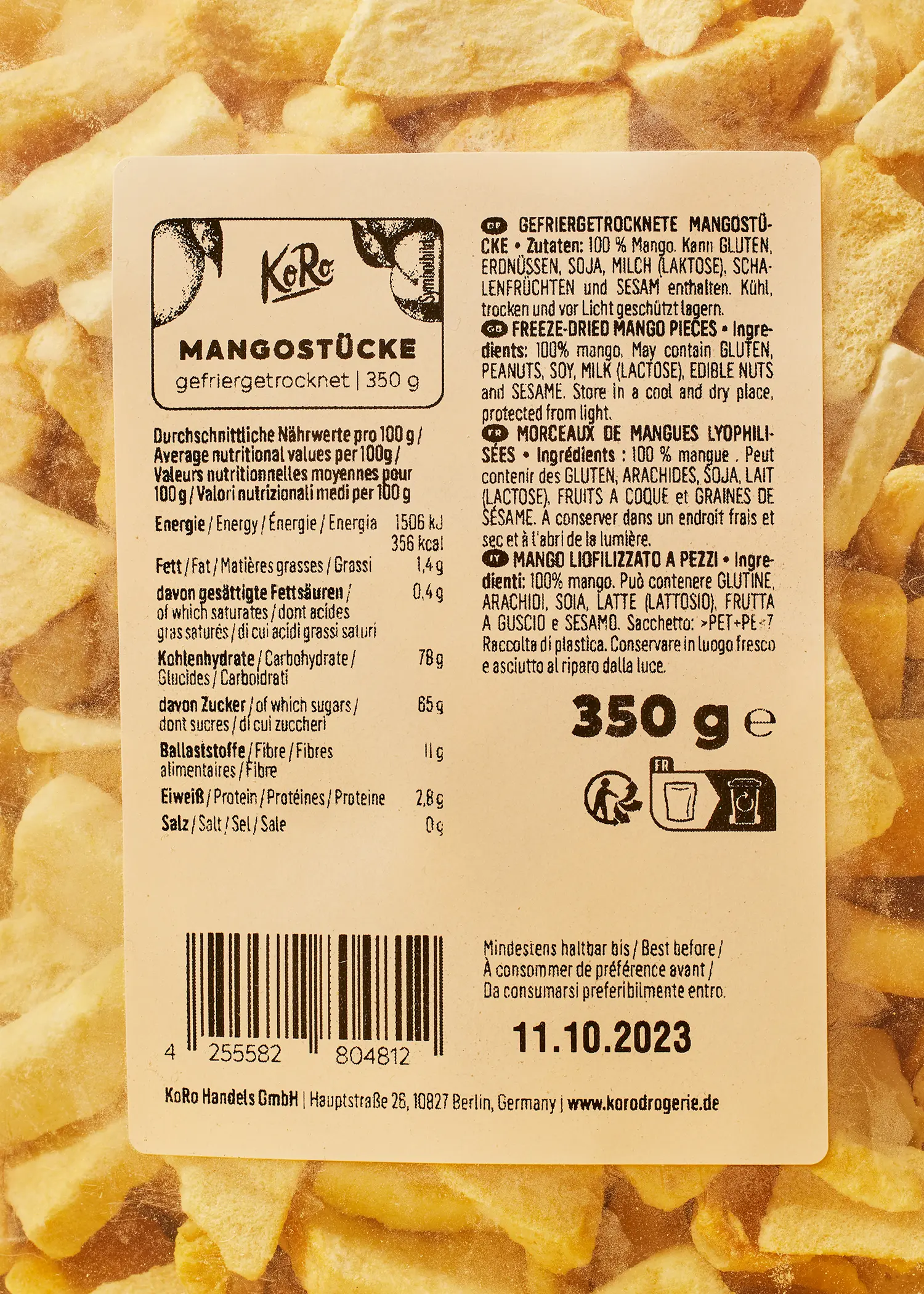 Is mango one of your favourite fruits? Now wonder – this incredible tropical fruit has long been a fan favourite around the world. Little to no one will argue against the flavour of the summer fruit. The only argument against the mango is that it can be cumbersome to chop it up because of the large seed in the center. BUT: KoRo has a solution! With our freeze-dried mango chunks, you can skip that step and go straight to enjoy pure mango flavour! Our mango comes ready to eat, in chunks, so you the only effort required is reaching into the bag — order our mango chunks now in a 350g value pack!